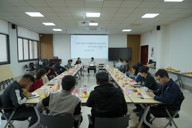 在圆桌会议上,与会辅导员纷纷从实际出发,从自身出发,强调问题导向,共话研究生管理工作改革与发展。设计学院分团委书记吴雨琛分享了不同专业研究生评价体系设计理念;理学院分团委书记许金红分享了实际管理工作中的难点及应对举措;食品学院辅导员李琳分享了“食研江南”研究生协同育人工作室的思路构想;食品学院辅导员吴爽分享了大学生创新创业教育的相关经验。指导教师在点评中强调:作为研究生辅导员,一要紧抓工作重点,理解研究生的特点、难点和亮点,注重依靠导师力量,关切学生心理健康;二要探索协同育人,多条线、多学科、多部门之间共商研究生思政教育、共破工作困境;三要提升自身认知,在更多的交流和更深的研讨中回望初心、不负所托,做好研究生成长成才的引路人。