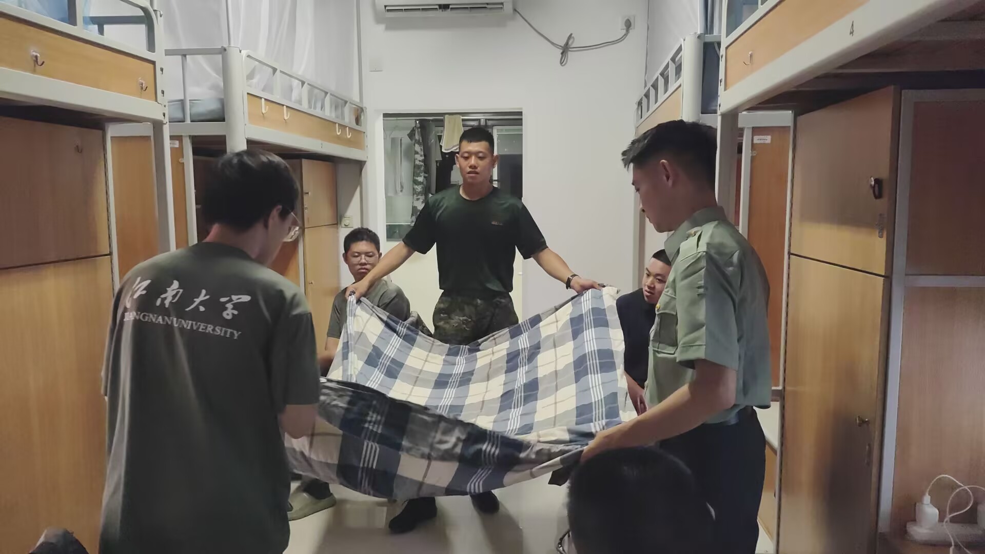 在溪苑88栋209宿舍内,教官们亲自示范,一边详细讲解叠被子的关键步骤,一边指导同学们动手操作:铺平、折叠、塑形……动作清晰规范,确保每名在场的新生都掌握要领。新生们在一旁认真观看学习,并积极动手尝试,宿舍四人协力练习叠“豆腐块”,在反复的练习中不仅逐渐掌握技巧,更凝聚了宿舍成员之间的情谊。为便于学习,副班主任全程录制教学视频,供新生反复观看学习。
