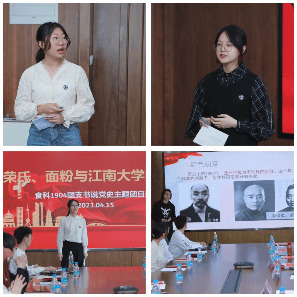 活动伊始,班长王泽绪通过一段视频介绍了“建党100周年”焦点故事汇项目的工作理念和总体设计。随后,他回顾了党课实践学习历程——食科1904团支部围绕“荣家、面粉和江南大学的渊源”主题完成第一阶段的实践学习和第二阶段的理论研讨。紧接着,食科1904团支书卢梦娇开始了第三阶段的党课分享。她讲述了荣氏家族的传奇一生,总体概述了三代荣氏代表对国家发展做出的贡献。团支部成员姜成辰、崔静、章灏三位同学分别从“面粉大王”“红色资本家”“近代教育事业先驱者”三个角度进行了深入的研究和探讨,并结合自身实际分享了自己的心得和感悟。