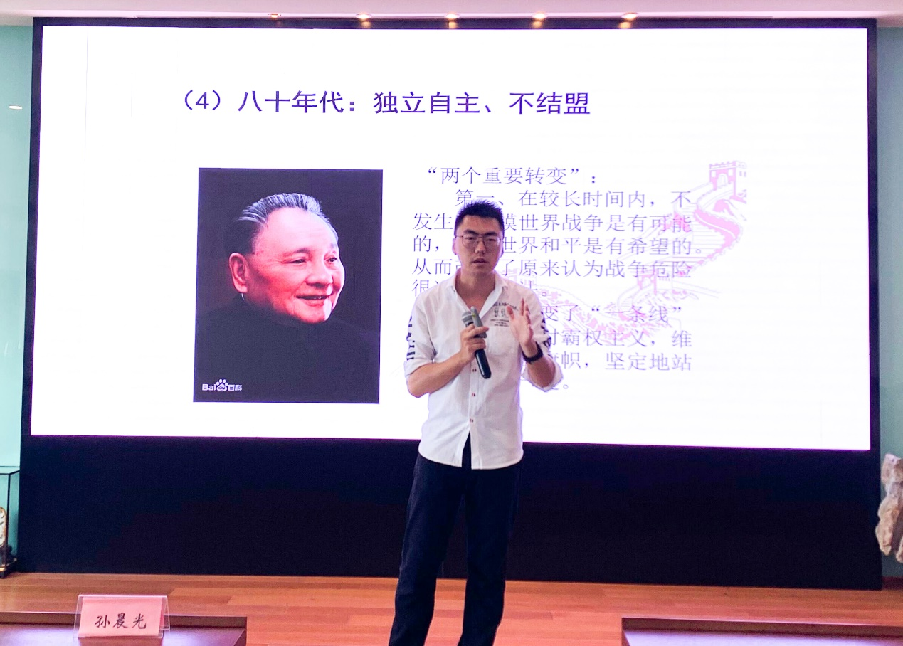 孙晨光老师以“党史与大国外交”为主题给同学们带来精彩的党课。孙老师按照时间脉络详细介绍了新中国的“一边倒”外交政策,六十年代的“两个拳头打人”、七十年代的“一条线”“一大片”、八十年代的“独立自主,不结盟”、九十年代的“韬光养晦”以及迈入新世纪的“全方位外交”政策变化背后的具体原因与历史故事。授课过程中,孙老师用诙谐幽默的语言,生动诠释了具有中国特色的大国外交。