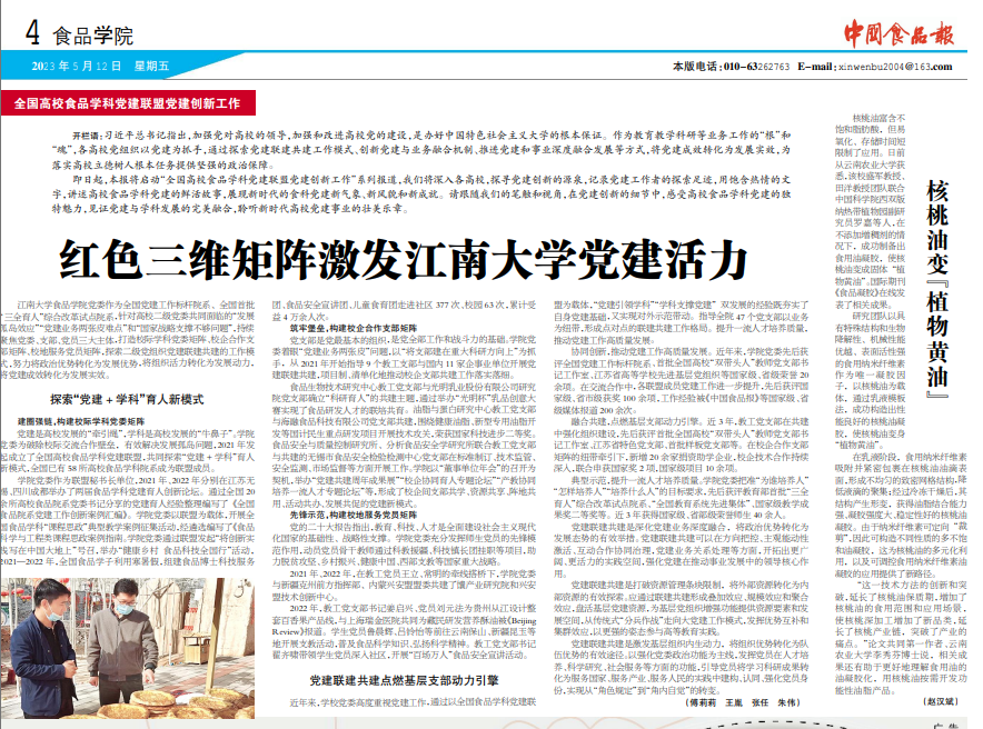 5月12日《中国食品报》报道了bat365在线官方网站党委以红色三维矩阵激发党建活力的经验做法。作为全国党建工作标杆院系、全国首批“三全育人”综合改革试点院系,食品学院党委针对高校二级党委共同面临的“发展孤岛效应”“党建业务两张皮难点”和“国家战略支撑不够问题”,持续聚焦党委、支部、党员三大主体,打造校际学科党委矩阵、校企合作支部矩阵、校地服务党员矩阵,探索二级党组织党建联建共建的工作模式,努力将政治优势转化为发展优势,将组织活力转化为发展动力,将党建成效转化为发展实效。随后,浙江大学、吉林大学、西北农林科技大学等13所高校围绕党建思政、立德树人、三全育人、服务国家战略等主题分期介绍了工作经验。