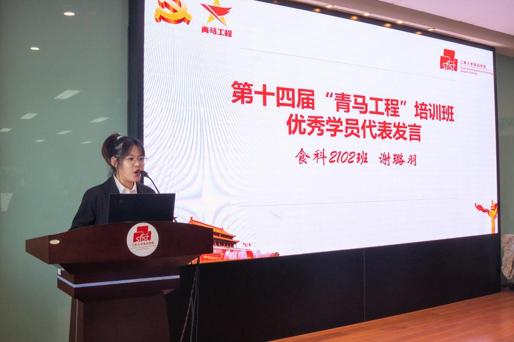 第十四届“青马工程”培训班优秀学员代表谢璐羽分享了在“青马工程”培训班学习的点滴感悟与实践经验,号召全体学员将理论学习贯穿始终,坚定不移听党话、跟党走,学思想、强党性、重实践、建新功,立志做有理想、有担当、能吃苦、肯奋斗的新时代好青年。