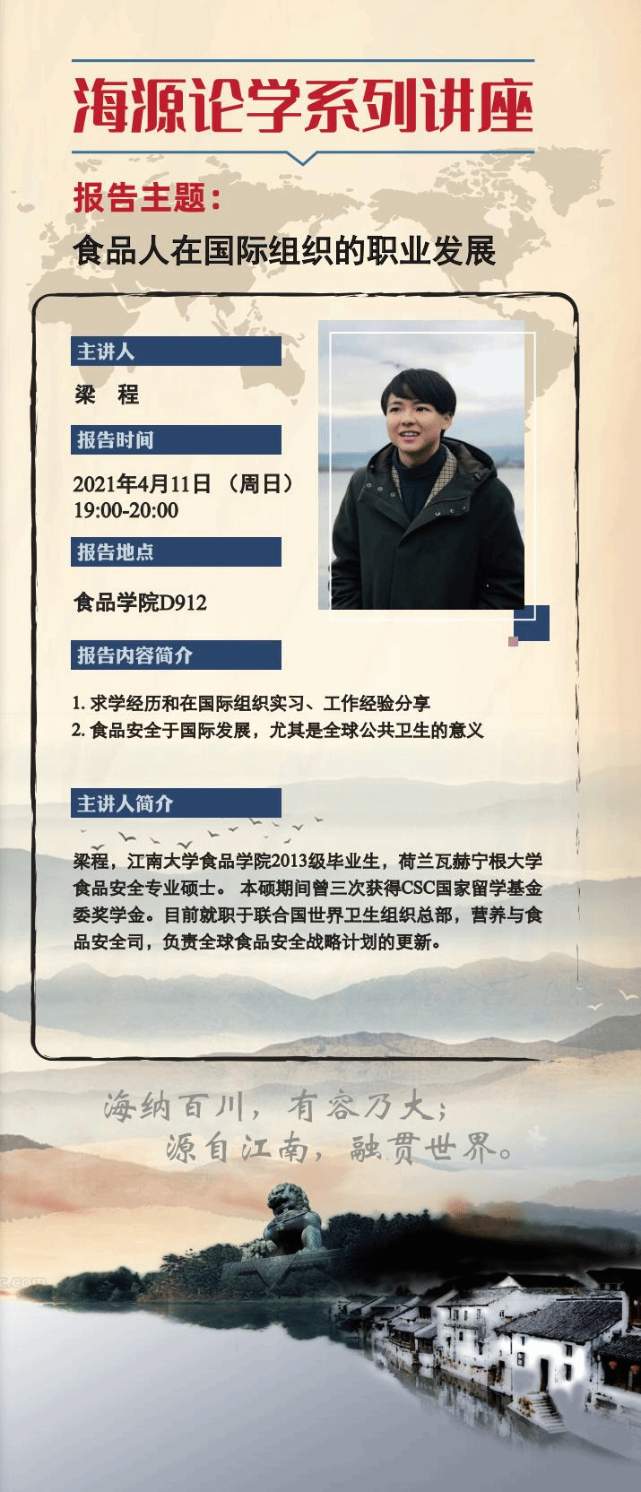 2021年4月11日晚,海源论学系列讲座第四讲在食品学院D912隆重举行并取得圆满成功。本次讲座嘉宾邀请了优秀校友梁程作题为“食品人在国际组织的职业发展”的线上报告,食品学院国际交流秘书蒋敏主持报告,中外合作办学班全体同学参加。