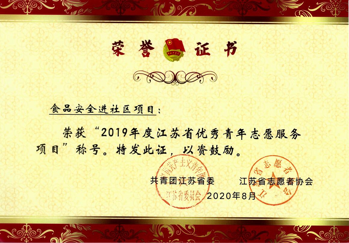 近日,由共青团江苏省委、江苏省志愿者协会联合开展的2019年度全省青年志愿者行动评选表彰工作结果正式揭晓,食品学院“食品安全进社区”项目荣获“2019年度江苏省优秀青年志愿服务项目”称号,为食品学院社会实践活动优秀团队再添省级荣誉。