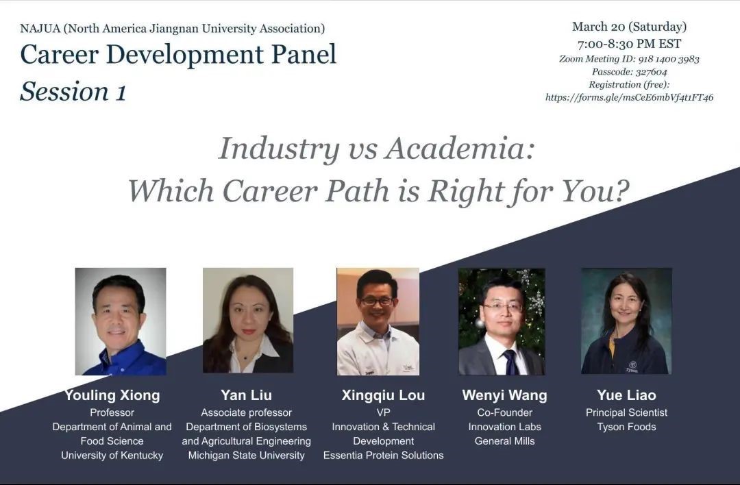 2021年3月21日,北美校友会联合bat365在线官方网站共同主办“北美校友会杰出校友职业发展论坛”第一期,就“工业界vs学术界:哪种更适合你?”这一主题进行了探讨。论坛由校友Yuting Zhou主持,肯塔基大学熊幼翎教授、密歇根州立大学刘岩副教授、Proliant公司楼星球副总裁、通用磨坊创新实验室联合创始人王文一、泰森食品首席科学家廖悦作为论坛嘉宾分别从工业界、学术界两个层次分享了他们职业生涯的经验、建议及相关信息,以帮助校友及海内外学生制定正确的职业发展规划。