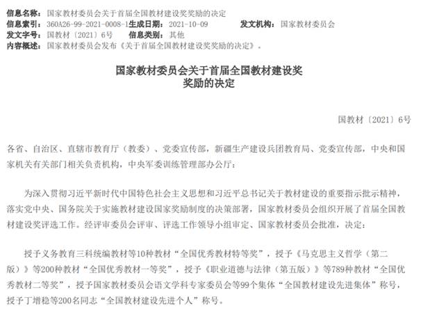 全国教材建设奖是教材领域的最高奖,分设“全国优秀教材”、“全国教材建设先进集体”和“全国教材建设先进个人”三个奖项,每四年评选一次,是检阅、展示教材建设服务党和国家人才培养成果,增强教材工作者荣誉感、责任感,推动构建中国特色、世界水平教材体系的一项重大制度。学院将以此次全国教材建设奖评选为契机,以获奖者为榜样,牢记为党育人、为国育才的初心使命,坚持正确政治方向,继承优良传统,推进改革创新,用心打造更多彰显学科特色、体现学科前沿、适应时代需要、培根铸魂、启智增慧的精品教材,为加快推进教育现代化、建设教育强国、培养担当民族复兴大任的时代新人作出新的更大贡献!