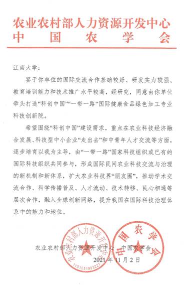 基于bat365在线官方网站在国际交流合作、科学研究、教育培训和技术推广方面良好的基础,农业农村部人力资源开发中心、中国农学会经研究讨论同意由江南大学作为牵头单位打造“科创中国”“一带一路”国际农业科技创新院。未来,“科创中国”“一带一路”国际农业科技创新院将围绕科创中国建设需求,重点在农业科技经济融合发展、科技型中小企业“走出去”和中青年人才交流等方面开展工作,逐步培育以江南大学为主导、由“一带一路”国家科技组织等共同参与的国际民间农业科技交流与治理新机制和新体系,推动学术交流合作、科学传播普及、人才流动、技术转移和民心相通等多维度、多层次合作,努力融入全球创新网络,提升我国在国际科技治理体系中的能力和地位。
