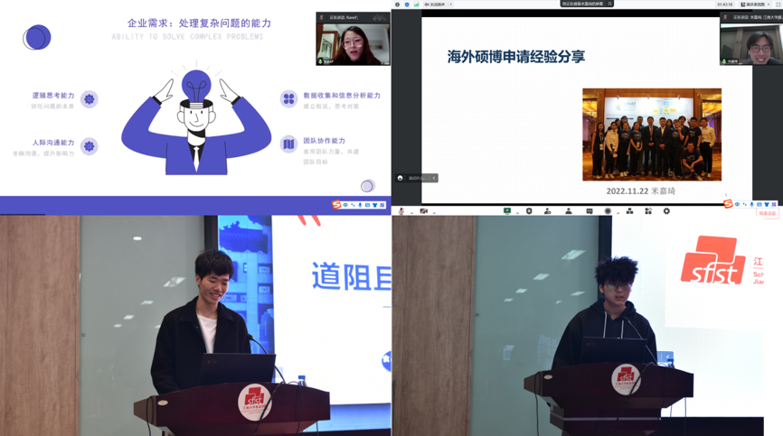 首先,2018届本科毕业生凤瑢、2020届本科毕业生米嘉琦通过线上就国外院校申请求学及工作经历与大家进行了云分享。他们简要介绍了自己的海外求学经历,从申请时间、语言成绩、前期准备等问题进行解答,讲解在国外留学深造的一系列准备工作和具体流程,并在出国英语考试、择校、研究方向选择、工作等方面给出了实用性建议。