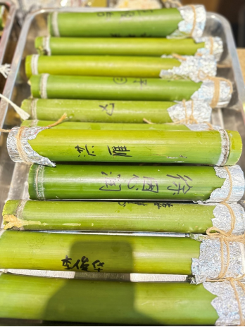 活动有非遗古法扎染、制作竹筒饭、播种向日葵及互动游戏等环节。首先,在扎染工艺师的指导下,大家发挥想象与智慧,将预先准备好的丝巾通过折叠、捆扎、扭曲等手法进行造型,然后用细绳、夹子等工具进行绑扎固定,再浸泡染料片刻,即可染制出“独一无二”的图案纹理。随后,大家一起动手制作清香诱人的竹筒饭,将大米混合玉米、虾仁、火腿等食材,放进新鲜的竹筒里,蒸制一个小时,飘香四溢的竹筒饭便热腾腾地出炉了。最后,来到向日葵播种区域,一起松土、播种、浇水,在亲身实践中体验劳动与种植的乐趣。洒下一粒粒种子,也栽下一株株“希望”。
