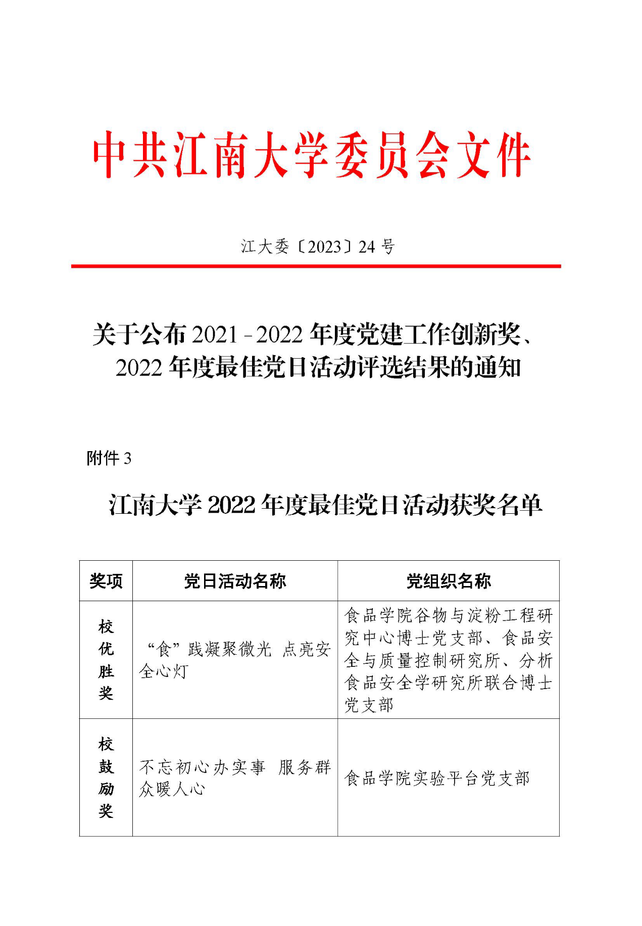 近期,江苏省委教育工委公布了江苏高校2021-2022年度党建工作创新奖评选结果,学校党委公布了江南大学2022年度最佳党日活动获奖名单。食品学院获江苏省党建工作创新奖二等奖,谷物与淀粉工程研究中心博士党支部和食品安全与质量控制研究所、分析食品安全学研究所联合博士党支部及实验平台教工党支部分别获江南大学最佳党日活动优胜奖和鼓励奖。