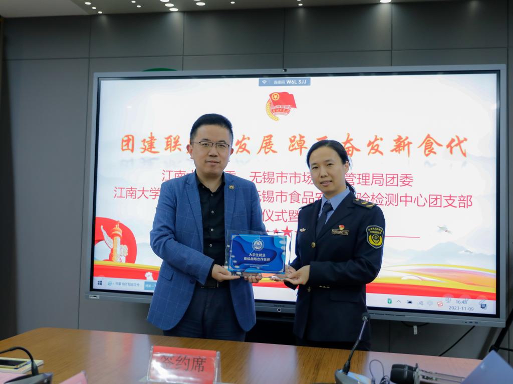 为感谢和表彰无锡市市场监督管理局、无锡市食品安全检验检测中心对江南大学众多毕业生的吸纳和培养,李雷分别向两家单位颁授“大学生就业最佳合作伙伴”铭牌。倪凌燕向参加活动的团员同学赠送《无锡青年办事一本通》。