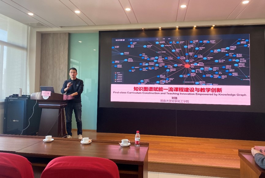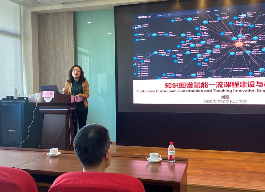 随后,刘强作题为“知识图谱赋能一流课程建设和教学创新”的精彩报告。他从教育数字化转型和知识图谱、知识图谱构建及其关系辨析、知识图谱如何赋能一流课程建设、知识图谱如何赋能混合式教学创新,四个主要方面进行了详细的介绍和分享。同时引用大量的案例和数据,展示了知识图谱在化学化工领域的应用和效果,引发了现场教师的强烈共鸣和热烈讨论。他还介绍了湖南大学化学化工学院在知识图谱方面的探索和实践,包括建立了化学化工知识图谱平台、开发了基于知识图谱的智能教学辅助系统、推进了基于知识图谱的混合式教学模式等。他鼓励食品学院的教师积极利用知识图谱,创新教学方法和学习方式,提升教学质量和学习效果。