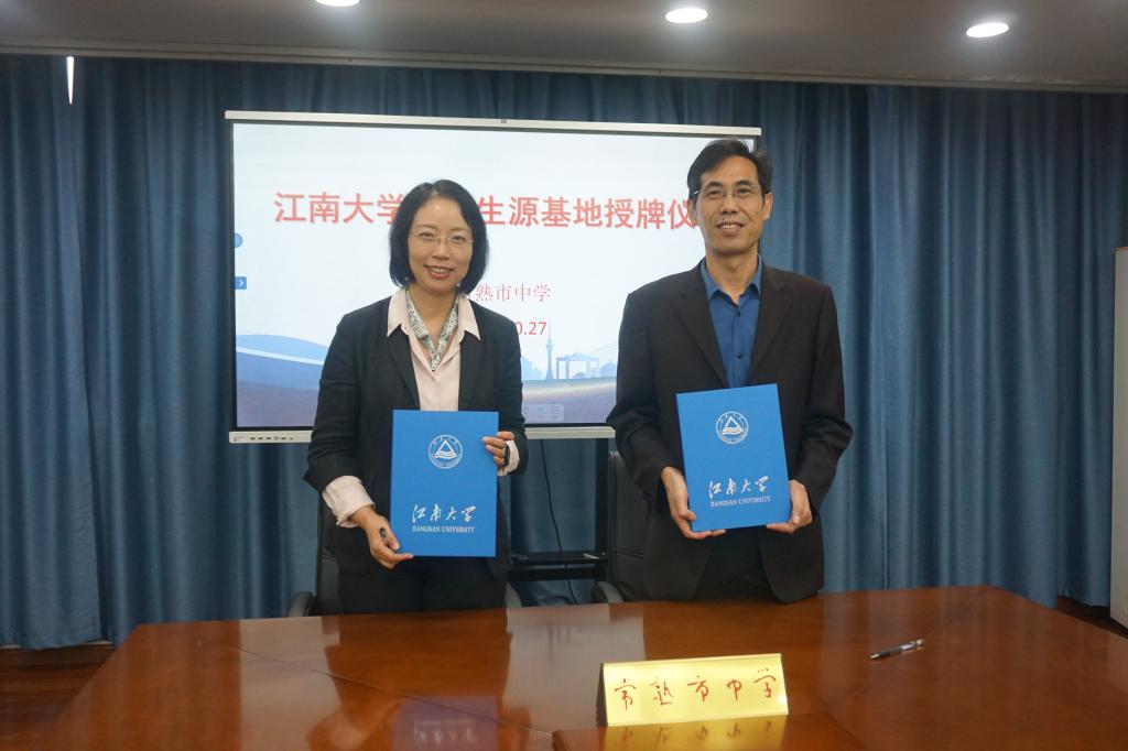 10月27日,江南大学与常熟市中学签署优质生源基地协议并举行授牌仪式。常熟市中学党委书记马宁,副校长邵俊峰、朱梅、张一览;bat365在线官方网站党委书记傅莉莉、副院长孙秀兰,本科招生办公室吴琰嘉、宋璟,苏州招生组负责人高雅慧等出席签约授牌仪式。仪式由邵俊峰主持。