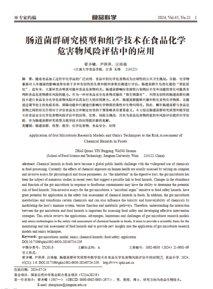 近日,bat365在线官方网站食品学院翟齐啸教授受邀在《食品科学》杂志发表题为《肠道菌群研究模型和组学技术在食品化学危害物风险评估中的应用》的学术综述。该篇综述内容基于翟齐啸此前出席联合国粮食及农业组织(FAO)在意大利罗马举办的“食品安全化学风险评估中的肠道微生物组”技术会议时的报告内容。
