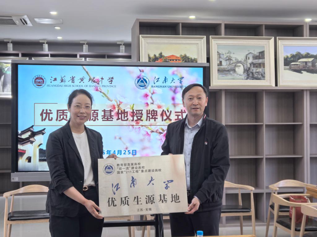 4月25日,江南大学“优质生源基地”授牌仪式暨“未来食品与美好生活”讲座活动在江苏省黄埭中学举行。黄埭中学校长邢德清、副校长鲁衍春,食品学院党委书记傅莉莉、副院长程力等出席活动,共同见证两校深度合作新征程的开启。