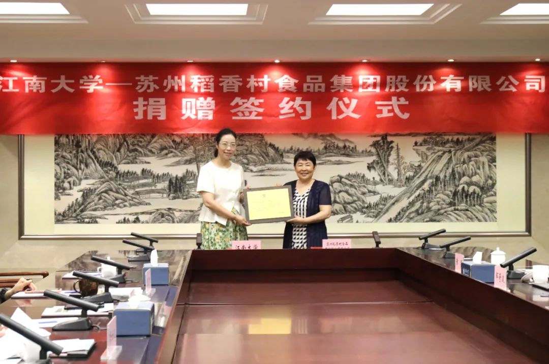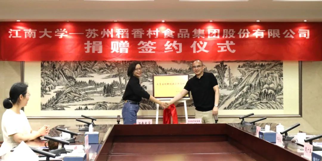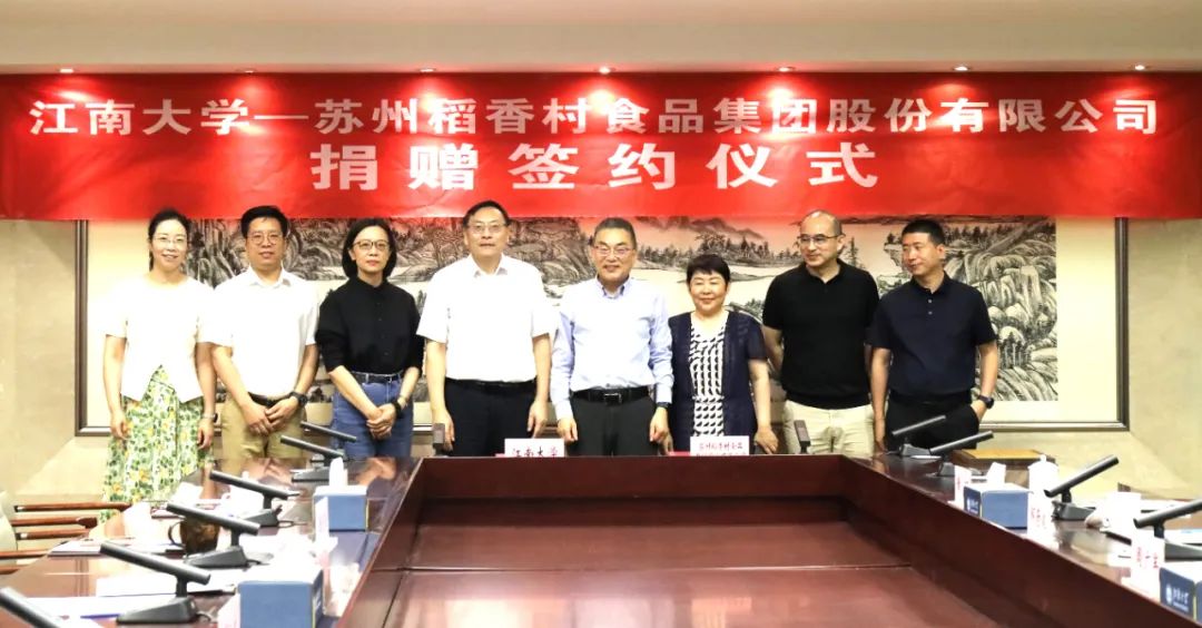 7月1日上午,苏州稻香村食品集团股份有限公司董事长周广军(制糖工程1979级校友)、总经理王芳(制糖工程1980级校友)、福吉佳公司总经理邹奇波(食品科学与工程1986级校友)等一行5人来访bat365在线官方网站,双方在行政楼B305会议室举行江南大学—苏州稻香村食品集团股份有限公司捐赠签约仪式。江南大学党委书记、教育发展基金会理事长吴正国,中国工程院院士、校长陈卫,党委常委、副校长张影陆,社会合作与校友联络处及食品学院相关负责人出席活动。