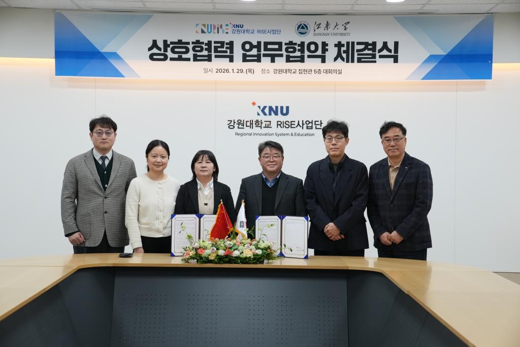 1月29日上午,bat365在线官方网站与江原国立大学“区域创新系统与教育中心”(RISE Corps)正式签署合作谅解备忘录。根据协议,双方将在共建食品技术生态系统、教师互访、学生交换、联合科研及共同举办学术活动等领域开展深度合作。此次签约标志着两校合作关系迈入以具体项目为驱动的崭新阶段。