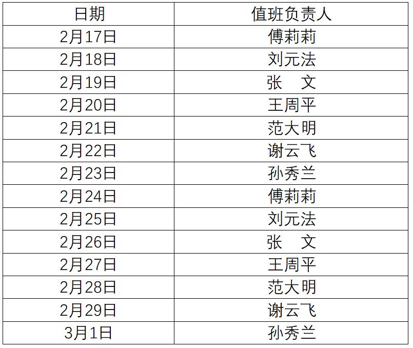 食品学院新型冠状病毒肺炎疫情防控期间值班表(2月17日-3月1日)