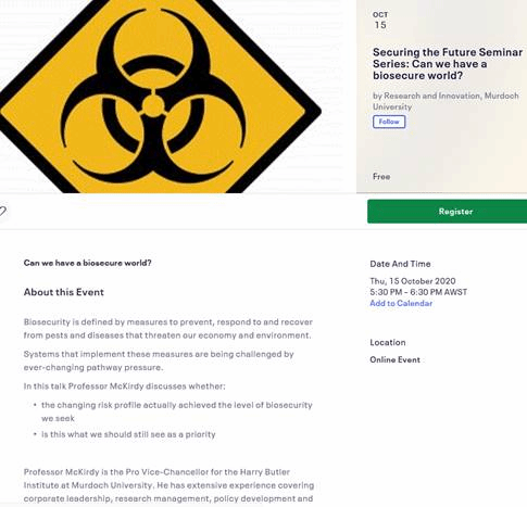 参会登记链接:https://www.eventbrite.com.au/e/securing-the-future-seminar-series-can-we-have-a-biosecure-world-tickets-121898021263?utm_campaign=postpub&utm_medium=em&utm_source=sm&utm_content=viewevent(若直接点击无效,请尝试Ctrl+点击链接)