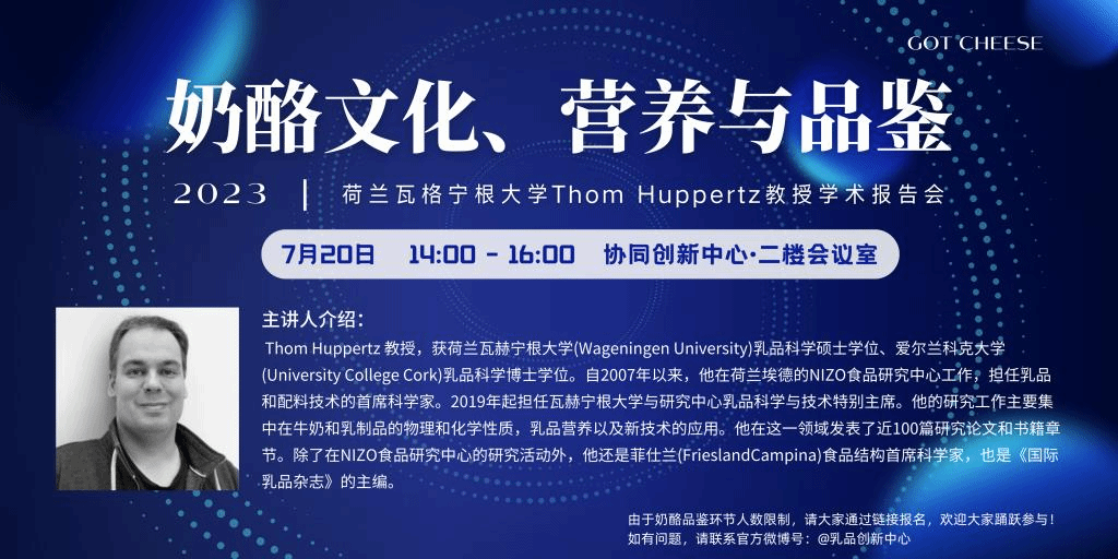 主讲人简介:Thom Huppertz教授,获荷兰瓦赫宁根大学(Wageningen University)乳品科学硕士学位、爱尔兰科克大学(University College Cork)乳品科学博士学位,2007年以来担任荷兰埃德的NIZO食品研究中心乳品和配料技术的首席科学家,2019年起担任瓦赫宁根大学与研究中心乳品科学与技术特别主席,研究工作主要集中在牛奶和乳制品的物理和化学性质,乳品营养以及新技术的应用,并在这一领域发表了近100篇研究论文和书籍章节。除了在NIZO食品研究中心的研究活动外,Thom Huppertz教授还是菲仕兰(FrieslandCampina)食品结构首席科学家,也是《国际乳品杂志》的主编。