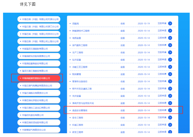 选择“中海油能源发展股份有限公司”→“食品安全管理岗”